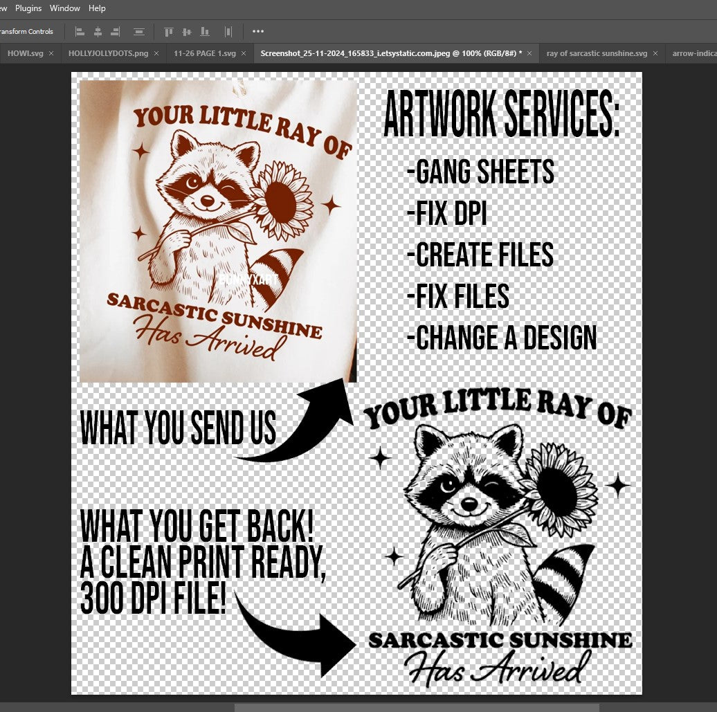 If you need help creating a gang sheet, custom designs/files, or low DPI that you're having trouble correcting, let us help! We will send back print ready files!