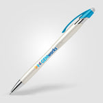 This plastic ballpoint pen features one of our most popular pen styles, now offered with a pearlized metallic painted barrel, chrome accents, colored clip and satin silver stylus.
